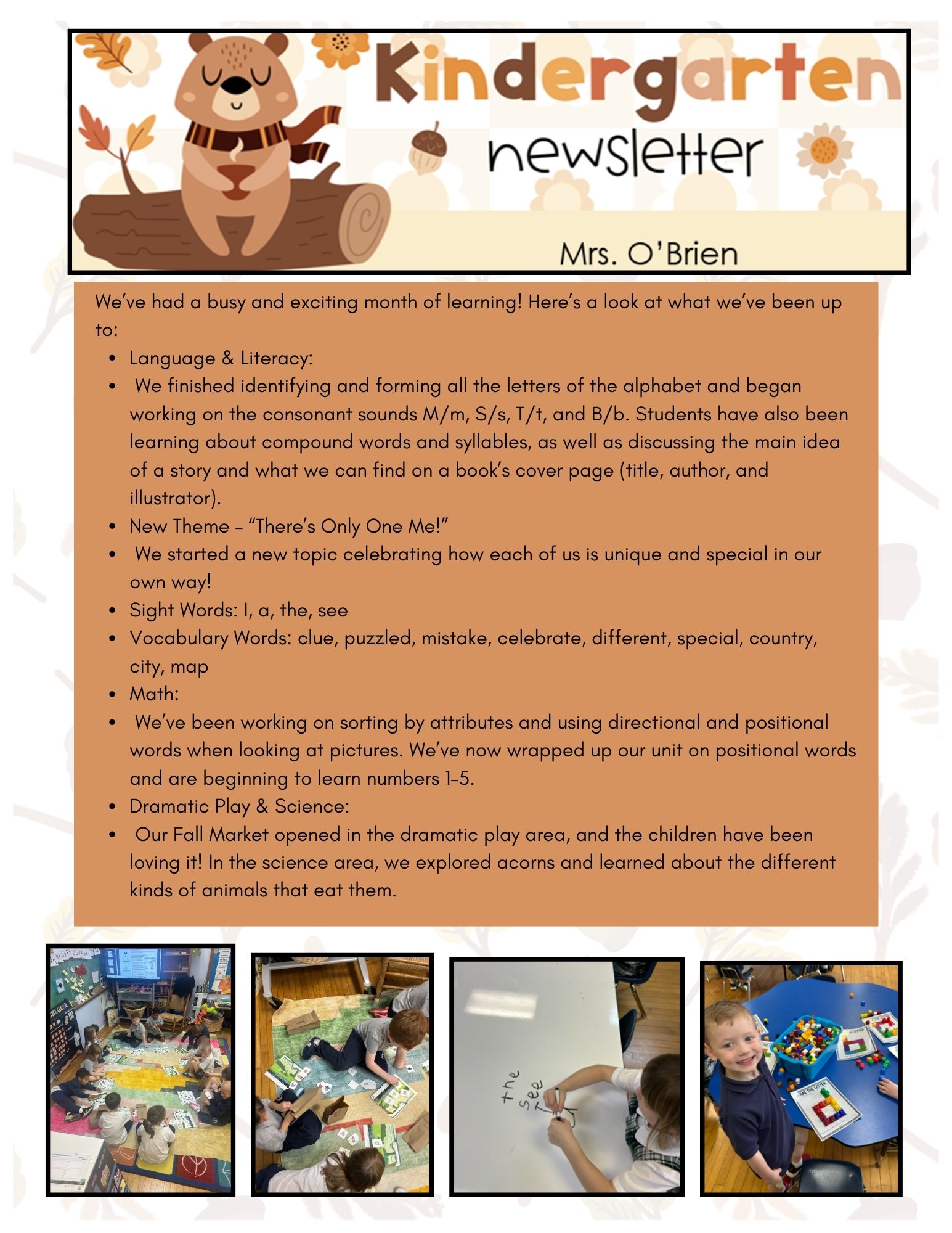 My name is Mrs. O’Brien and I am thrilled to start the new year in the kindergarten class! I love working with young students and I am excited to help them grow socially, emotionally, and academically, in a safe, nurturing, and fun environment!